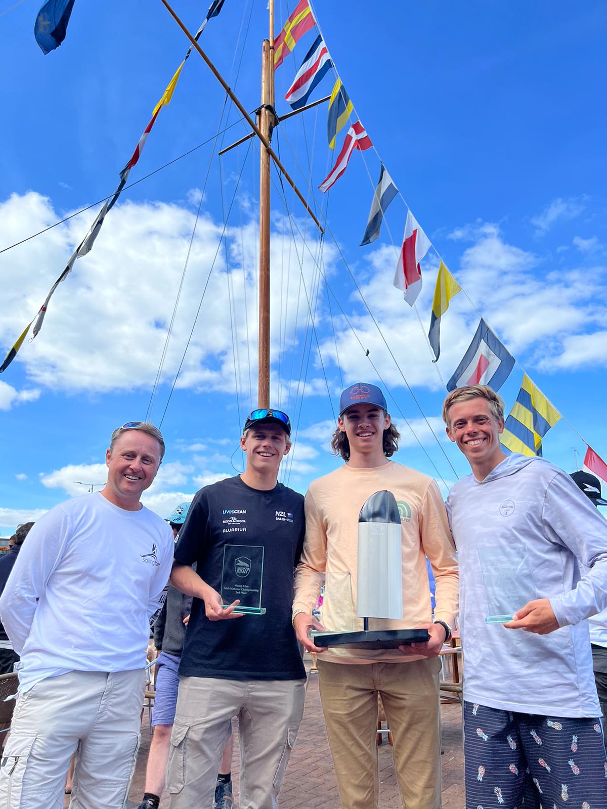 Pictures of winners Charlie Cullen National Champion RSGYC, Second place Zac Blomeley, Funsport Rhosneigr, Wales, third place Gavin Ball, Hawaii Kai Boat Club, USA, with Duncan Hepplewhite, Sailing fast.